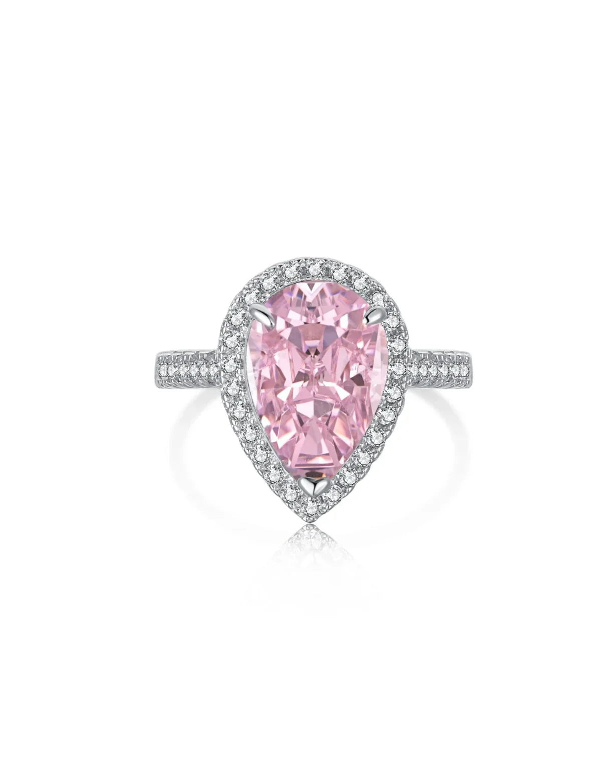 Der Mittelpunkt dieses Schmuckstücks ist ein wunderschöner rosa Stein in Tropfenform, der sofort alle Blicke auf sich zieht. Umrahmt wird er von zahlreichen glitzernden Zirkonia-Steinen, die das Licht aus jedem Winkel einfangen und den Ring erstrahlen lassen.