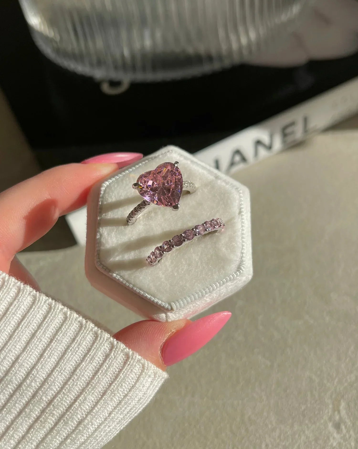 Dieser exquisite Ring mit herzförmigem Stein ist das perfekte Accessoire, um Ihre Persönlichkeit zum Ausdruck zu bringen. Der strahlende Rosaton des Steins in Kombination mit dem funkelnden Band verleiht jedem Look einen Hauch von Romantik und Eleganz. Ideal für besondere Momente oder als Zeichen Ihrer Zuneigung.