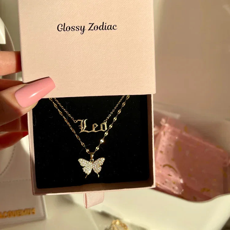 Diese einzigartige goldfarbene Kette kombiniert ein glitzerndes Schmetterlings-Symbol mit einem individuellen Sternzeichen-Anhänger. Das zarte, doch auffällige Design wird in einer eleganten Schachtel geliefert und ist das perfekte Geschenk für jeden Anlass. Es ist ein persönliches Accessoire, das Stil und Bedeutung vereint.